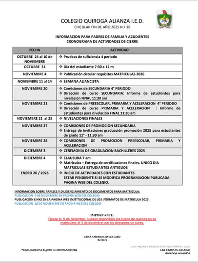 El Colegio Quiroga Alianza se permite invitar a la comunidad educativa a la audiencia publica de rendición de cuentas.
